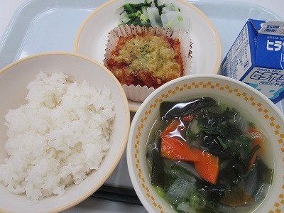 ・ご飯 ・厚揚げのピザソース焼き ・ドレッシングサラダ ・じゃがいものスープ ・牛乳