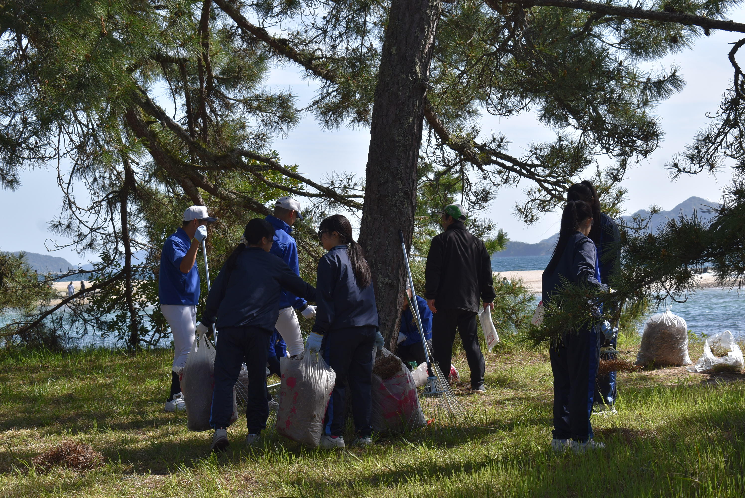 朝から各部活動や生徒会の生徒が多数参加し、地元地域である天橋立の清掃活動を行いました。生徒たちは、落ちている松葉や雑草を取り除きながら、互いに協力して作業に取り組みました。今回の活動を通して、美しい松並木や地域の環境を守ることの大切さを実感するとともに、地域に貢献する意義や助け合いの精神について考える貴重な機会となりました。