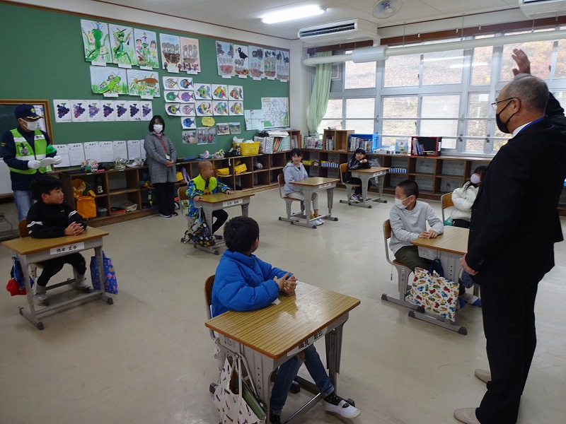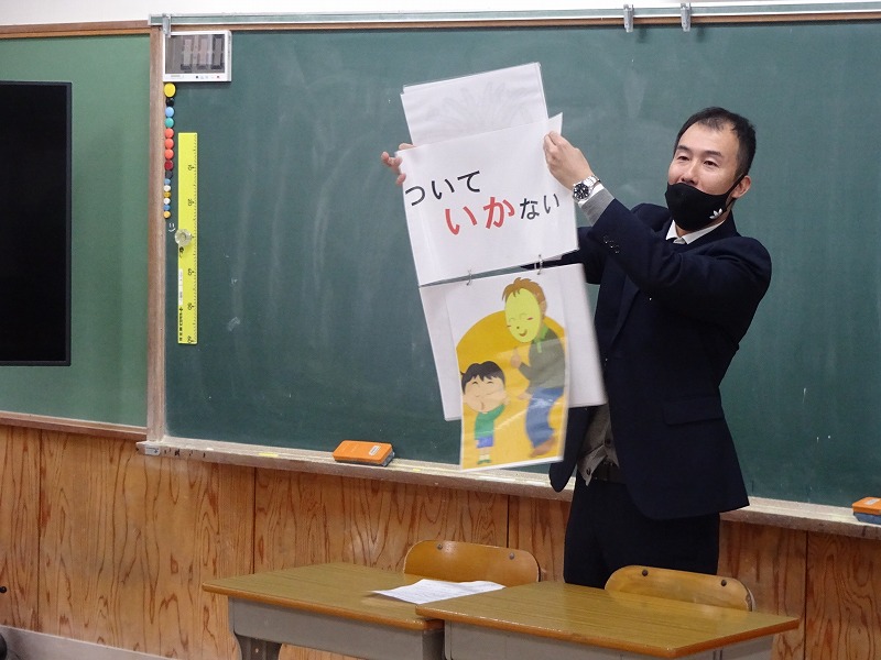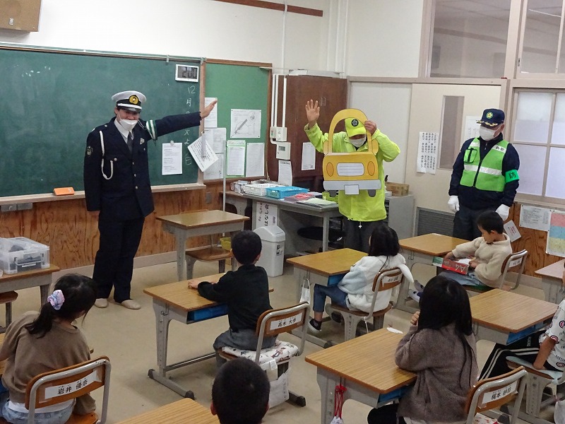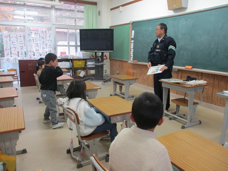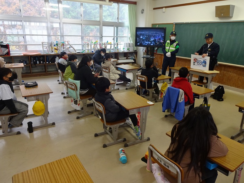 12月2日(火)南丹警察署、桧山駐在所、水原駐在所、防犯推進委員の方々にお世話になり、防犯教室を行いました。今年度は、交通安全ルールに関すること、不審者への対応に関すること、SNS等インターネットとの関わり方に関することの3つのことを学びました。南丹警察署の方々を中心に6つのグループに分かれて、1年生から6年生の各教室に巡回していただき、お話をしていただきました。それぞれ大変わかりやすいお話で、子どもたちはたくさん学びました。