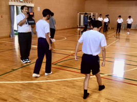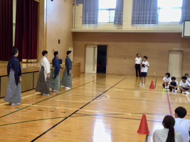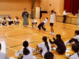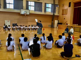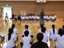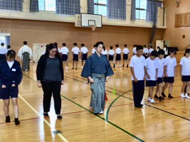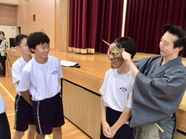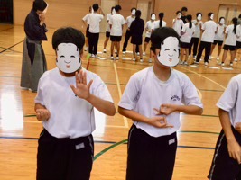 文化庁巡回公演事業のワークショップがありました。今年度体験させていただくのは「能」と「狂言」です。西宮市より『瓦照苑』の皆さんにお越しいただきました。「能」について歴史や演者についてわかりやすく教えていただき、『老松』の練習や狂言『仏師』の一部に挑戦するなど楽しいワークショップとなりました。