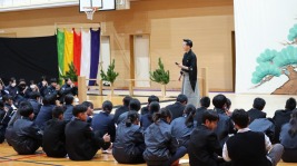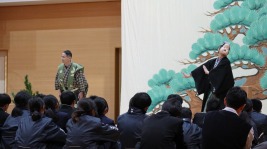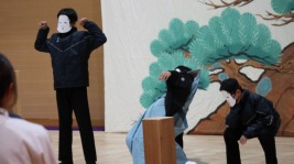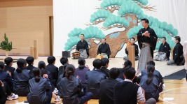 後半は、半能「大会(だいえ)」を鑑賞。能の開演前に執り行われる儀式「能奉行 舞台改め」に生徒代表が挑戦。時代劇さながらの裃(かみしも)を身にまとい、堂々の立ち振る舞い。「お能 始めませい」のかけ声に続き、お囃子に合わせて「老松」を全員で合唱しました。「大会」では能の独特の動きや、天狗のが帝釈天に懲らしめられるシーンなど、迫力満点でした。
