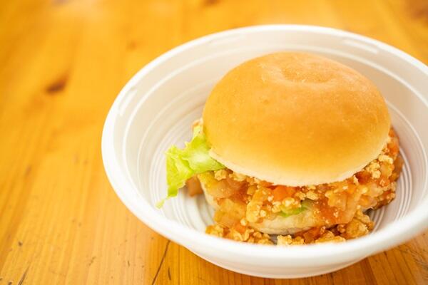 肉の量を減らし、豆腐を中心とした具材で作ったハンバーガーはトマトソース、ケチャップ、マスタードとも相性がよく、美味しく満足感のあるハンバーガーになりました。