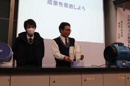 授業では、現在利用されているさまざまなエネルギーのメリット・デメリットについて、生徒との対話を交えながら考察し、現代のエネルギー問題を多角的に捉える視点を示していただきました。さらに、サボニウス型風力発電装置の仕組みや特長についてご説明いただいた後、実習を行いました。