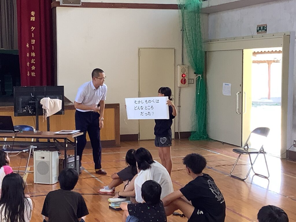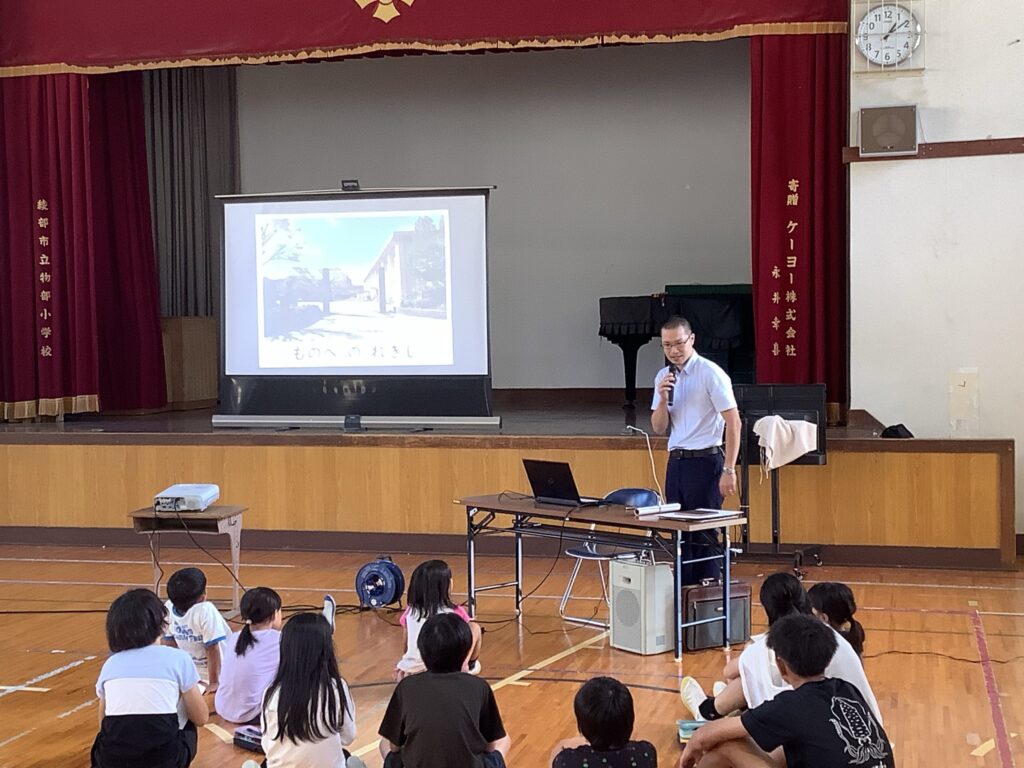 今回は常福寺の水野 裕喜 様に物部地域や物部小学校の昔の様子について話をしていただきました。人口の変動や昔の商店街の様子と今の様子、昔の物部地区運動会の様子などをクイズ形式で話されたり、写真や動画も効果的に示されたりしながら教えていただきました。子どもたちも興味深く話を聞いていました。