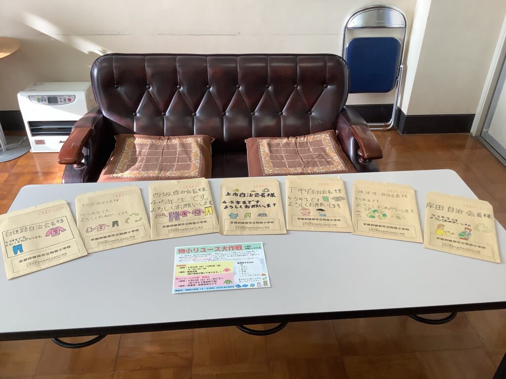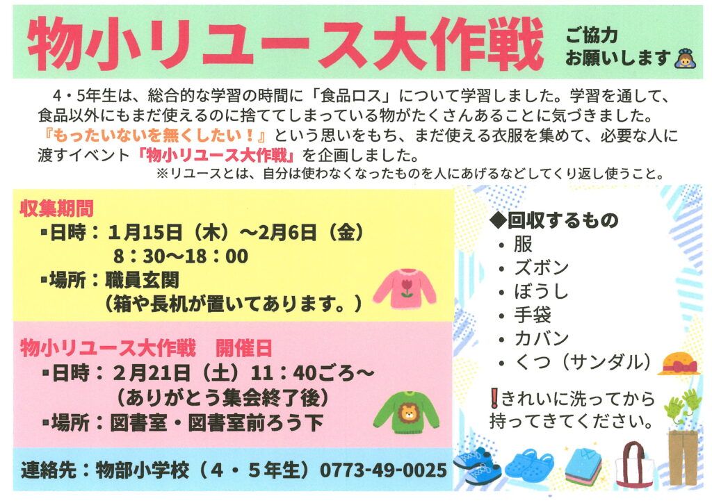 先日開催されたわくわくツアー発表会で4・5年生から提案があった「物小リユース大作戦」の取組がスタートしています。総合的な学習の時間で学び、気づいた「もったいないを無くしたい!」という思いからスタートしています。まだ使える衣服(服・ズボン・ぼうし・手袋・カバン・くつ等)を集め、必要な人に渡すことを考えています。先日の自治会長会でチラシを組回覧で見ていただけるようお願いをしております。