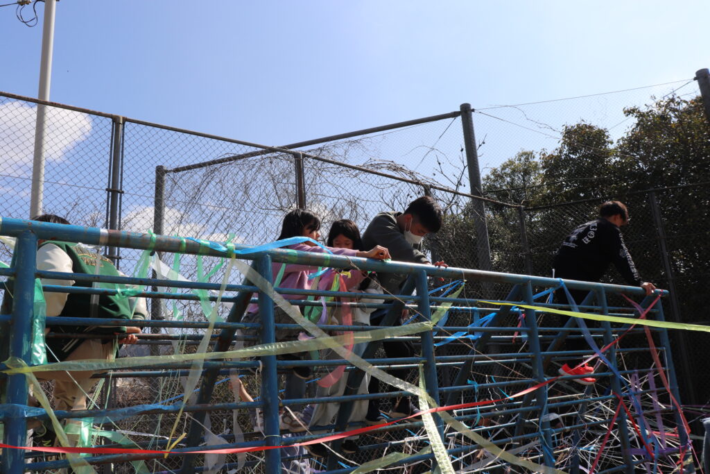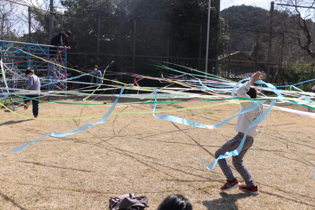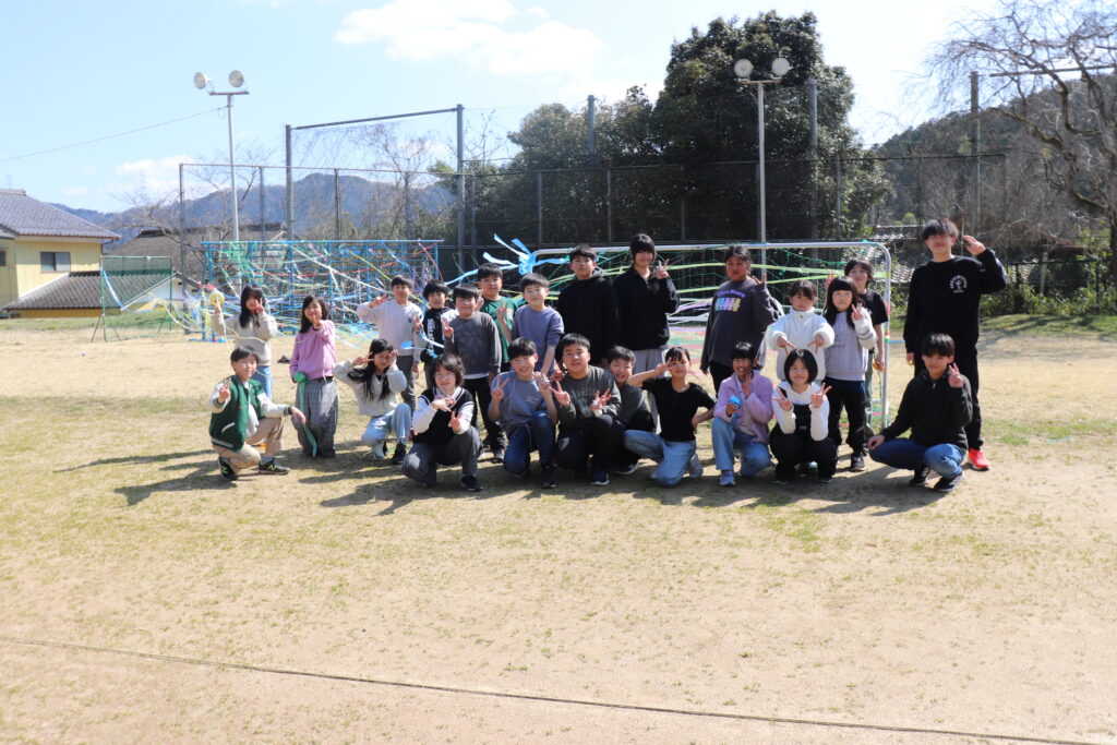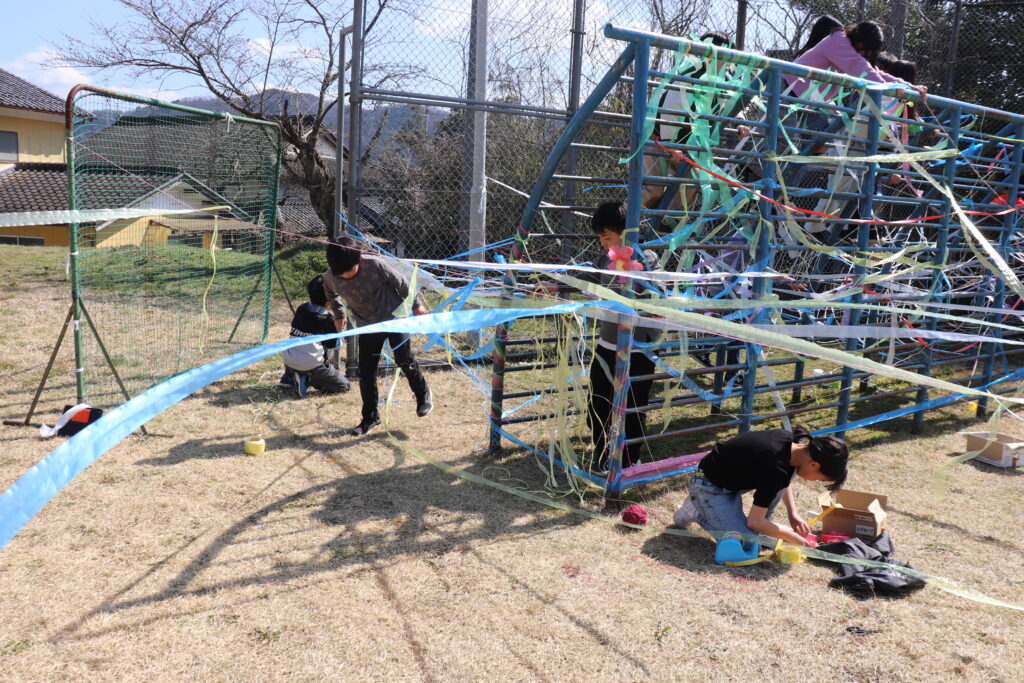 6年生 卒業に向けて(3・4年生との交流) 投稿 2026.03.17 3・4年生が6年生との思い出づくりを兼ねて、図工の造形あそびを行いました。 3・4年生と6年生が協力して、ろく木やサッカーゴール等にスズランテープを張り付け、一つの作品を仕上げました。