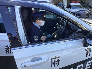 【写真】警察官の制服を着用してパトカーに乗車し、機器の説明を受ける様子