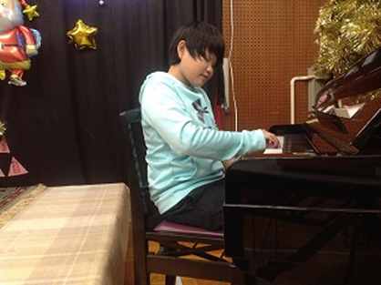 次は「きらきら星」のピアノ演奏です。演奏する舎生は、初めてのピアノ発表にドキドキしましたが、拍手喝采を受け、アンコール曲も堂々と弾き切りました。舞台発表の締めは職員による出し物、「白い恋人達」の合唱でした。