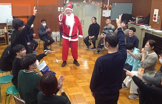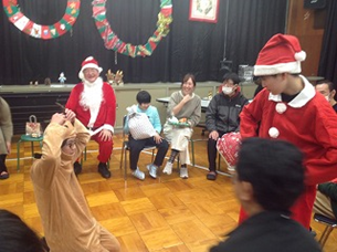 最後は恒例のプレゼント交換です。みんなで輪になって、サンタクロースとトナカイから配られたプレゼントを、音楽に合わせて隣の人に渡していきます。音が鳴り終わるタイミングでプレゼントを受け取り、ドキドキワクワク袋をあけ…舎生たちは自分がもらったプレゼントの中身を会場の皆にお披露目しました。