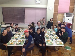 【写真】食堂でクリスマスディナーを囲んで集合写真