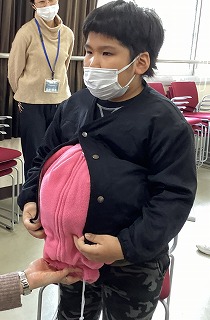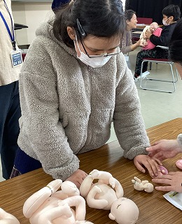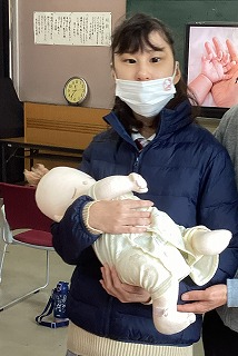 【写真】産まれた赤ちゃんの人形を抱き、重さや大きさを確かめている様子