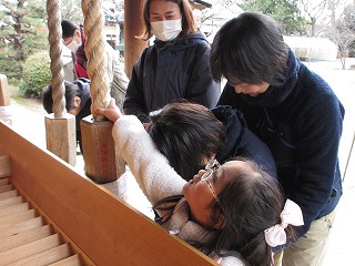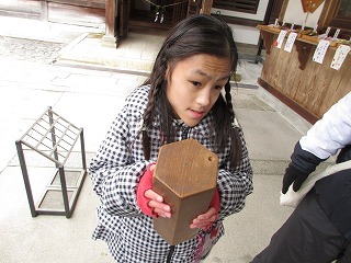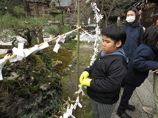 小中学部 (小)今宮神社 小中学部 2026.01.20 3学期2日目の朝、小学部の児童4人で、今宮神社に行きました。神様に新年のご挨拶をしたあとは、神社の敷地内を探検。大小さまざまなサイズや柄の絵馬、おみくじ筒やおみくじかけ、手水など、家や学校にはないものを、一人一人触って確認しました。字が読めるようになってきた児童は、絵馬やおみくじに、興味津々でした。 【写真】賽銭箱の前で手を合わせる児童と、鈴緒に手を伸ばす児童の様子 【写真】六角柱のおみくじ筒を持っている様子 【写真】おみくじかけを触察している様子 Post Views: 5