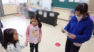 【写真】大徳寺校地で募集した川柳の投票用紙を配る児童生徒会役員の様子