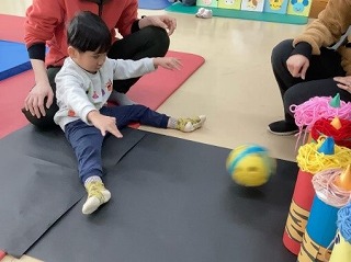 「おにたいじ ボウリング」では、いろいろなボールの中から自分の好きなものを選び、おにに向かって「エイッ!」「コロコロ…」と転がし、楽しみながら体を動かしました。