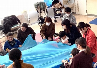 【写真】みんなで大きなリトミックスカーフを持って揺らしている様子