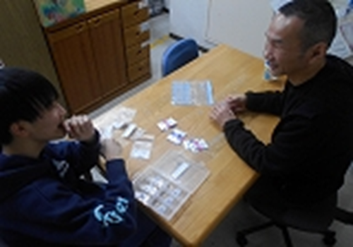 ある舎生は将来的な薬の自己管理を目指して、学校で服用する薬を自分で仕分けして持っていく練習を始めています。