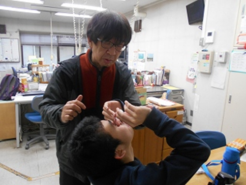 また、点眼の練習に取り組んでいる舎生もいます。指導員と手の使い方や目薬をかざす位置を丁寧に確認しながら練習を重ね、薬が多少目からあふれることもありますが、自力で点眼できるようになってきました。