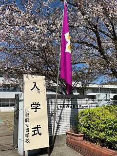 【写真】桜咲く花ノ坊校地玄関、「入学式」の立て看板