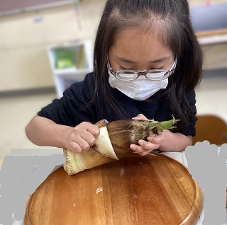 盲学校の子どもたちが、新年度を迎え、最初に触れる食材が「たけのこ」です。「京都のふるさとこんだて」の食材となる「たけのこ」の皮むきに、今年も挑戦しました。これまでの体験を生かし、慣れた手つきで皮をむく子や、触るたびに産毛が手につくことを気にする子。