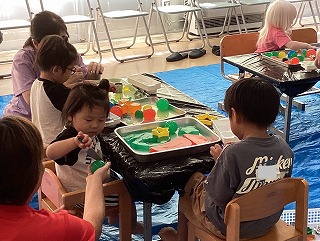 「感触あそび」は、「寒天」が登場!まずは乾燥した棒寒天を触って観察。両手で力いっぱいちぎったり、ゴワゴワゴツゴツした感触を確かめたりしました。次に登場したのが、色鮮やかなたくさんの寒天。板状のものや、球体のもの、球体が埋め込まれたもの等々、プルプル・ヒヤッ・プニュッ・ツルッとした感触を楽しみながら、つかんだり、道具を使って切ったり型抜きをしたり…夢中になって遊ぶ姿が見られました。となりにいるお友だちにやさしく「どうぞ」と渡したり、カップに寒天を盛りつけたりしているお友だちもいました。BGMに合わせて、お片付けもとっても上手にできましたよ。