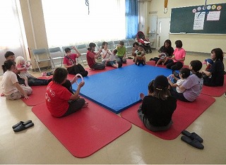 「音楽あそび」では、「あたま かた ひざ ポン」で体の部位を確認したり、「バスに乗って」では、膝の上でハンドルを持ちながら体を揺らしたり、親子でふれあい遊びをしました。