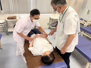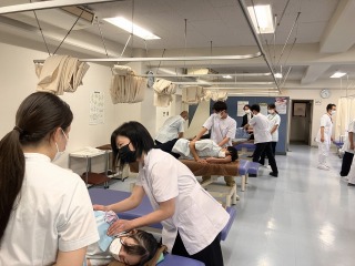 前半は、専門学校で実際に行われている「脈診(みゃくしん)と経脈(けいみゃく)への施術」をテーマに、授業を体験させていただきました。お互いの脈を診ながら経絡(けいらく)に沿ってあん摩を行い、脈の変化を確認するという東洋医学的な施術法に、本校生徒も真剣な表情で取り組んでいました。