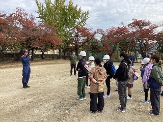 【写真】グラウンドへ避難し、消防士の方から避難についての話を聞いている様子