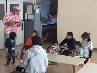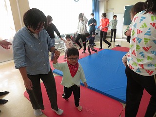 音楽あそびでは、「公園にいきましょう」の歌で、保護者の方のエクササイズを盛り込んだ動きを取り入れました。親子でのふれあいを通して、絆が深まる機会となりました。