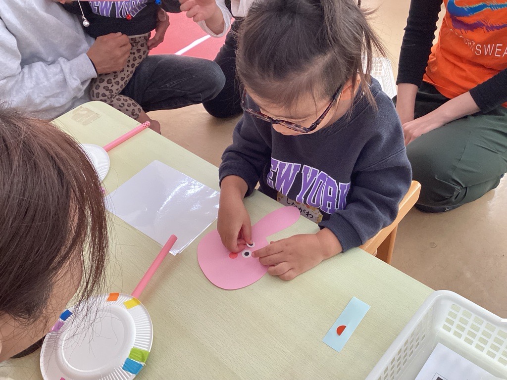 後半は、パネルシアターで「ぼくとどうぶつたちのおんがくかい」というお話を見聞きしたあと、お話に登場する動物をモチーフにした鈴の太鼓を制作しました。テープやシールをよく見て触って、はがしたり貼ったり…手指を使ってじっくり活動に取り組む姿が見られました。出来上がった太鼓を打ち鳴らし、ピアノとの合奏も楽しみました。お話に登場した楽器「ギター」や「ハーモニカ」にも触ったり音の響きを感じたりしました。
