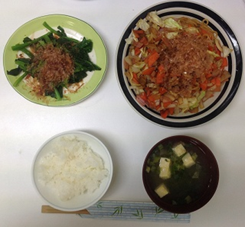 【写真】夕食メニュー 「焼きそば」「ほうれん草ソテー」「ごはん」「味噌汁」