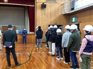 シェイクアウト訓練の放送後、非常ベルが鳴り、避難指示等の放送を聞き、生徒たちは教室に備えてあるヘルメットを被り皆落ち着いて体育館に避難し、北消防署の方から御講評をいただきました。