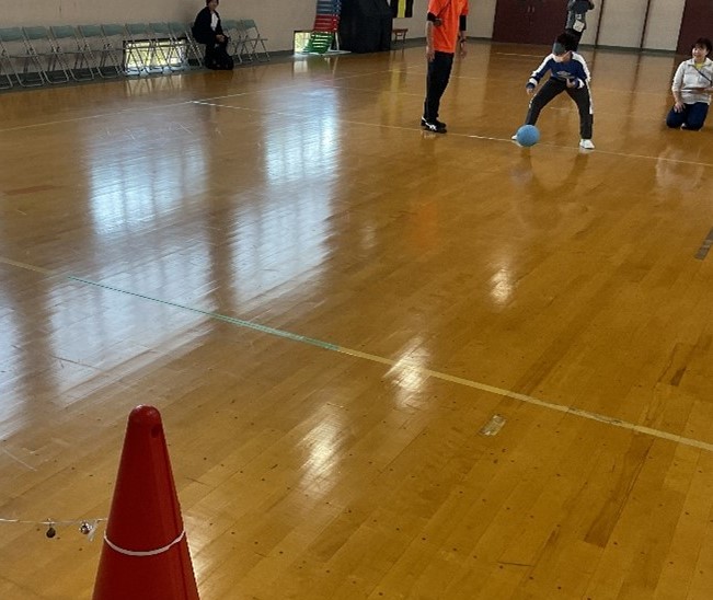 盲学校全体 (全)第2回サタデースクール①(大徳寺校地) 盲学校全体 2025.11.20 スクールⅠでは、体育館で視覚障害者スポーツ「ゴールボール」に挑戦しました。中に鈴が入ったボールを使い、目標めがけてボールを転がす、自分の近くに来たボールをキャッチするなど、指導者と一緒に練習を重ね、その後チームに分かれて試合に挑みました。 みんな楽しく活動できたようで、試合を終えてから家族の人とキャッチボールしている姿なども見られました。【写真】キャッチボールをしている様子 【写真】ゴールを狙って投げている様子 Post Views: 59