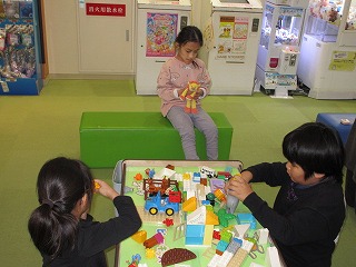 【写真】ブロックコーナーで遊ぶ3人の児童の様子