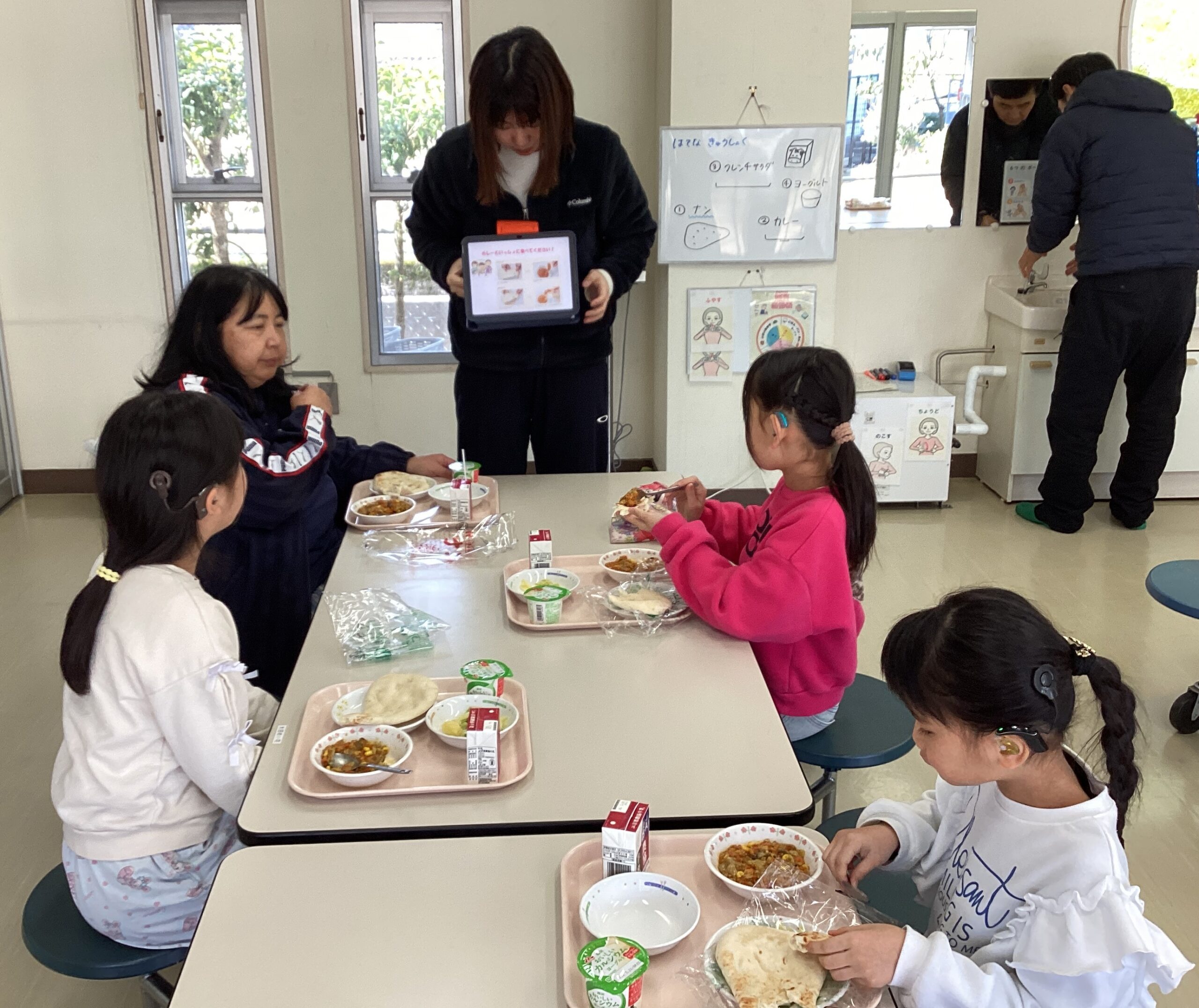 9日(月)に給食で『ナン』が出ました。カレーのルーにつけて美味しくいただきました。分校では初の献立です。栄養教諭から「ナン」という言葉の由来や、その食べ方を教えてもらいました。米飯とは違う形でカレーを楽しみました。