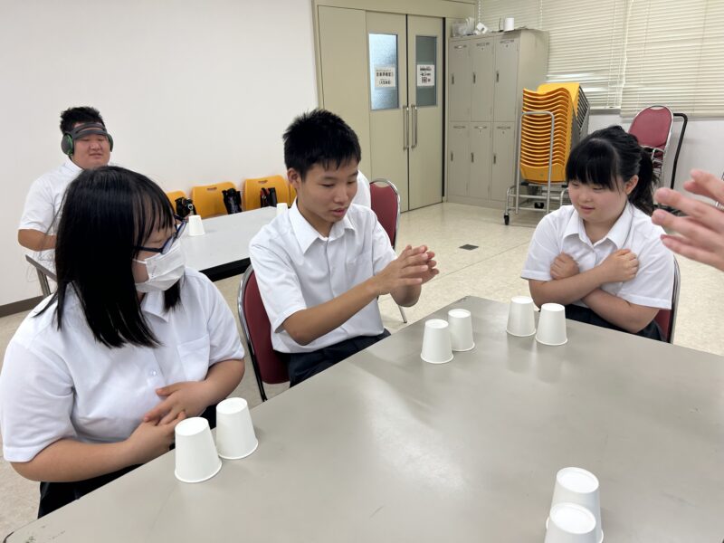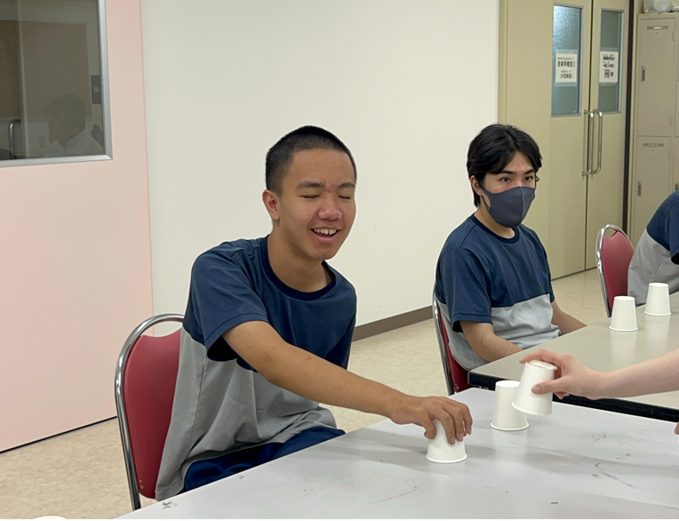 高等部 音楽「カップス」 令和7年度 高等部トピックス 2025.09.24 音楽ではカップスに取り組んでいます。初めて体験する生徒もおり、カップの鳴らし方を「底だと小さい音?」「角をぶつける音もいい!」等、考えながらチャレンジしています。1学期に取り組んでいたボディパーカッションの要素も入れながら、リズムよく音を鳴らしていきます。 指導者と基礎のリズムに取り組んでいます! 友達とリズムや身体の動きを確認しながらチャレンジしています。
