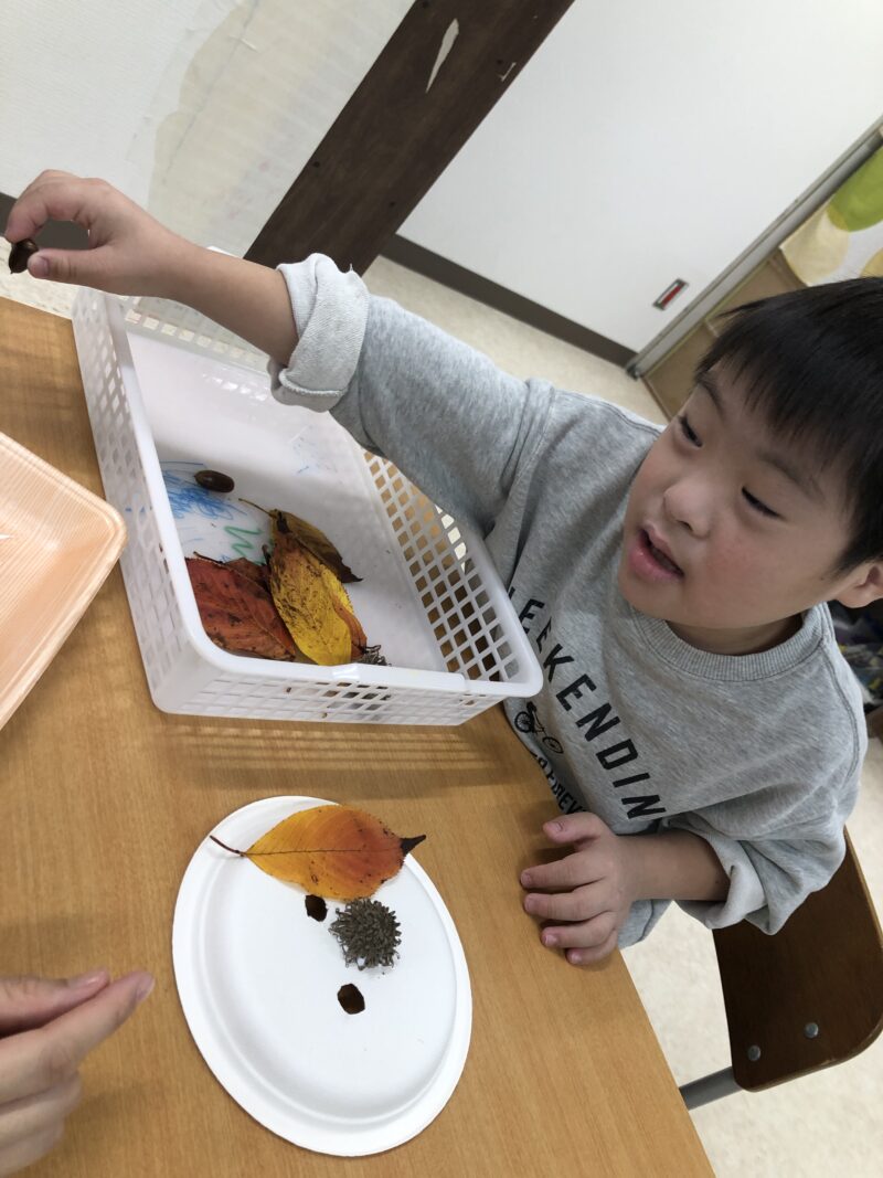 小学部8組 生活単元学習「あきをさがそう」 令和7年度 小学部トピックス 2025.12.02 「おちばいちば」という絵本を題材に、「8くみいちば」を作っています。自分たちで色々な商品を作り、お店をオープンしました。「8くみいちば」のお金はどんぐり!値段表を見て、数字に合った数のどんぐりを出します。「どれにしようかな~」と悩んだり「いらっしゃいませ~」と言ったりして、お客さんや店員さんになりきりながら学習に取り組む姿が見られました。 このどんぐりもつけよう! どれを買おうかな~