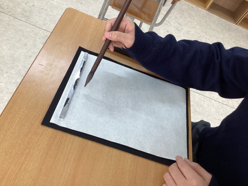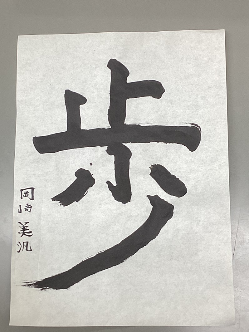 高等部10組 国語「書き初めをしよう」 令和7年度 高等部トピックス 2026.01.23 年明けの国語の授業は、「書き初め」に向けての授業を行いました。書き初めで書きたい漢字一文字と二文字を決め、漢字の意味をタブレット端末で調べました。高等部に入り、初めての書道でしたが、たくさん練習書きをして丁寧に書くことができました。また、漢字に込められた意味を考えて、ただ書くだけでなく気持ちも入れながら書くことも意識して取り組むことができました。 緊張しながら筆を持って書きました。 「歩」という漢字の書き初め。