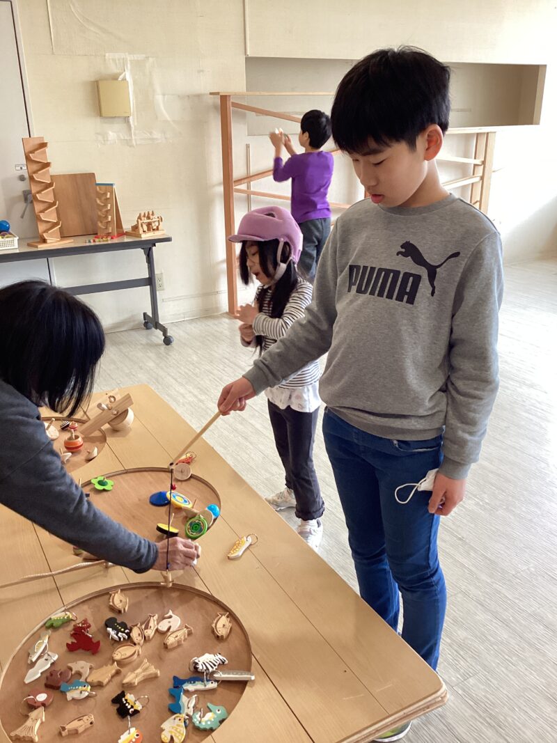 小学部16組 遊びの指導「昔遊び」 令和7年度 小学部トピックス 2026.02.06 1月の遊びの指導「昔遊び」では、地域の方が、昔の生活の道具(電話や草履等)やおもちゃについて紹介してくださりました。けん玉、万華鏡、コマ、射的、スマートボール等たくさんのおもちゃを体験しました。興味をもって話を聞いたり、体験したりすることができました。 けん玉名人のスゴ技を見たよ。制作したけん玉でやってみよう! 魚釣りやコマ等手作りの木のおもちゃで遊んだよ!