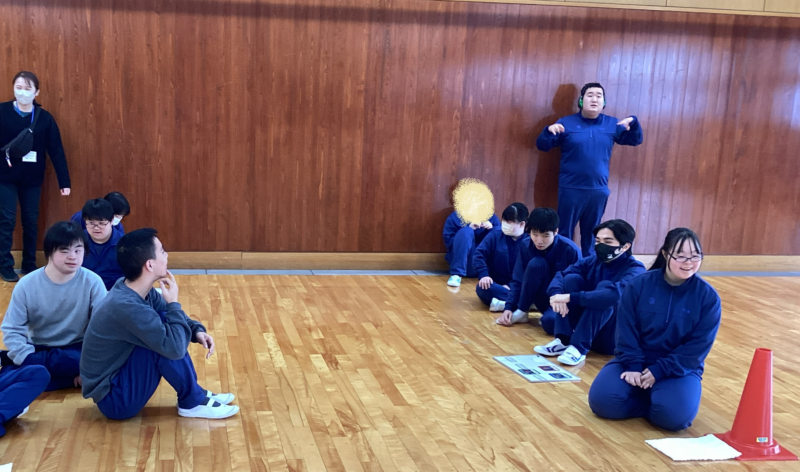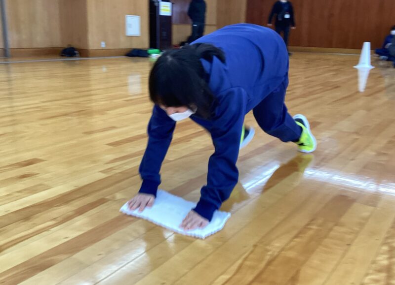 高等部 体育「全身運動」 令和7年度 高等部トピックス 2026.02.17 体育では全身運動に取り組んでいます。その中でも雑巾掛けリレーは生徒達が大盛り上がり!下半身の強化や体幹のトレーニングを目的とし、生徒達は手をしっかりと広げて腕を伸ばし、全力で身体を動かしていました。相手チームより早くゴールするためには順番をどうするか等、自分達で相談する姿も多く見られました。 チームで並び順を決めました! しっかりと足を動かし、目標をめがけて駆け抜けます。