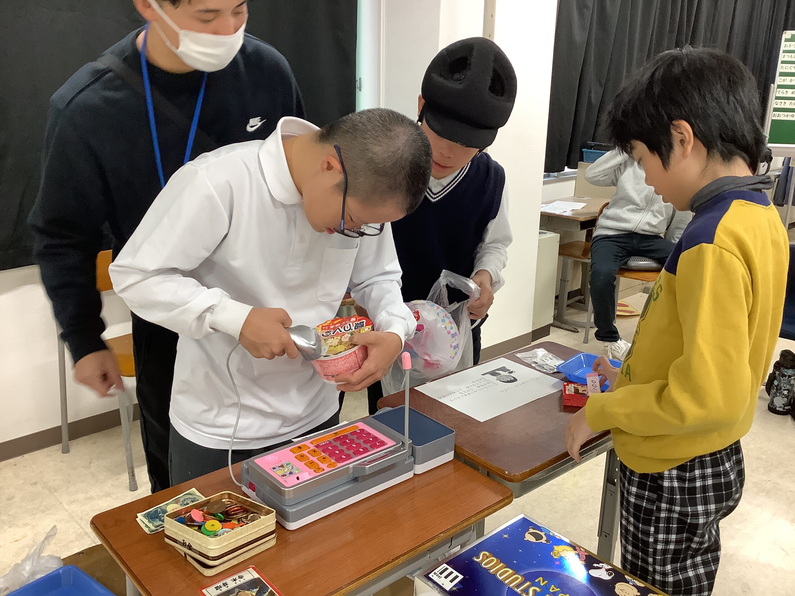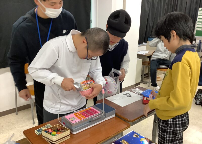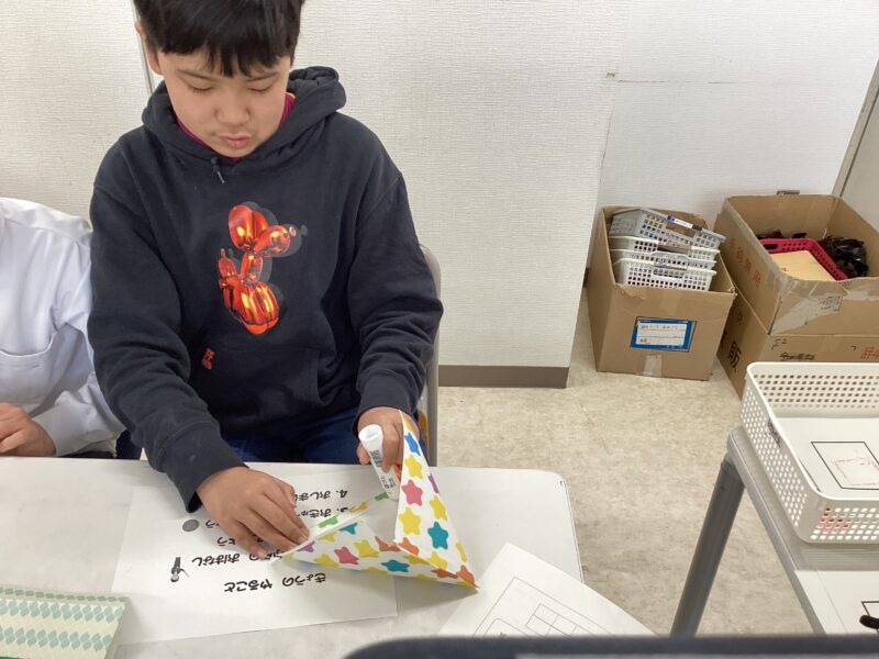 中学部2年生 総合的な学習の時間 令和7年度 中学部トピックス 2026.03.13 総合的な学習の時間で「勤労」について学習をしました。どんな仕事があるのかを見てみたり、考えたりしました。その後に「ワークマンになろう!」で掃除の仕事をしたり、軽作業をしたりして、給料としてコインをもらいました。そのコインで買い物学習をしてお金の使い方についても学習しました。 封筒のふちにのりを付けてたたんで完成! 欲しいものを見つけて、もらったお給料で買いました!