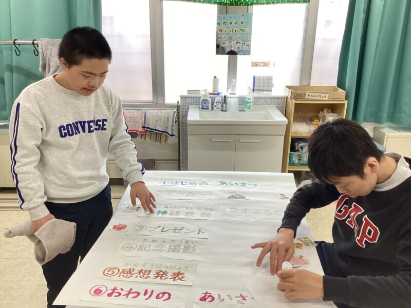 中学部6,7組 生活単元学習「卒業記念パーティーにむけて」 令和7年度 中学部トピックス 2026.03.13 中学部6,7組では、卒業を前にこれまでお世話になった先生方をお招きして、「卒業記念パーティー」を行いました。生徒たちがゲームの企画・運営に加え、看板やプログラム、招待状、記念品の準備まで協力しながら取り組みました。 2人で協力してプログラム作り! シールを貼って看板作り!