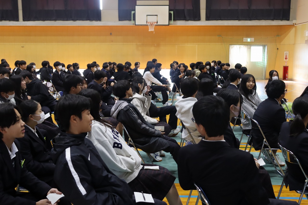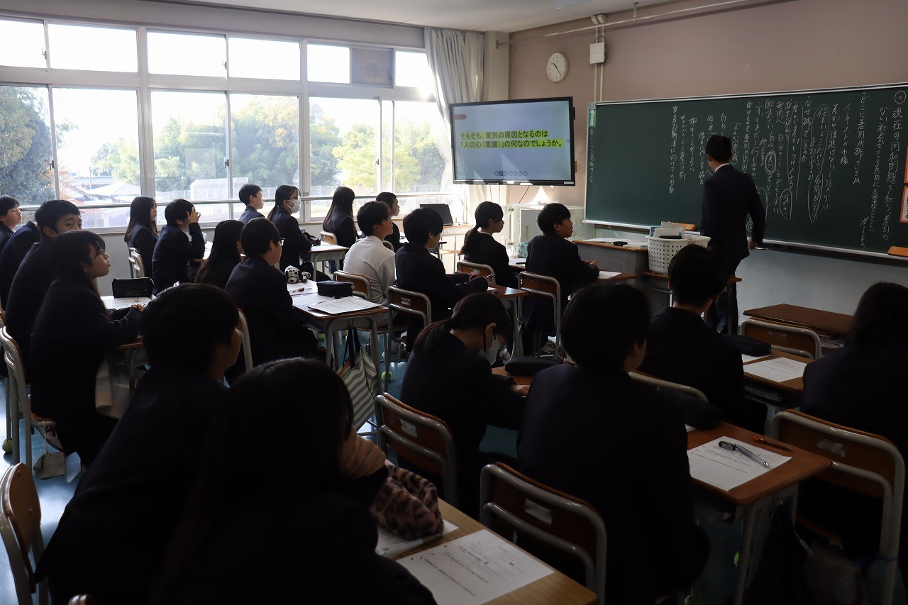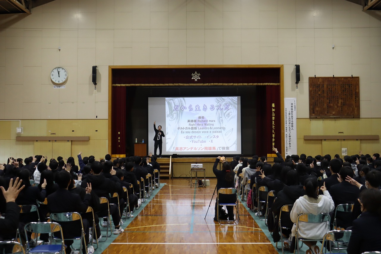 人権学習後、PTA人権講演会を行いました。多文化共生NPO世界人理事長である具志アンデルソン飛雄馬 様にお越しいただき、懸命に生きることの大切さについてご講演いただきました。自身の経験談やたくさんの名言、力強いメッセージに、生徒たちは一生懸命耳を傾けていました。これから先、たくさんの困難や壁にぶつかっても、具志さんからいただいたたくさんの言葉を胸に、一歩一歩進んで行ってほしいと願います。