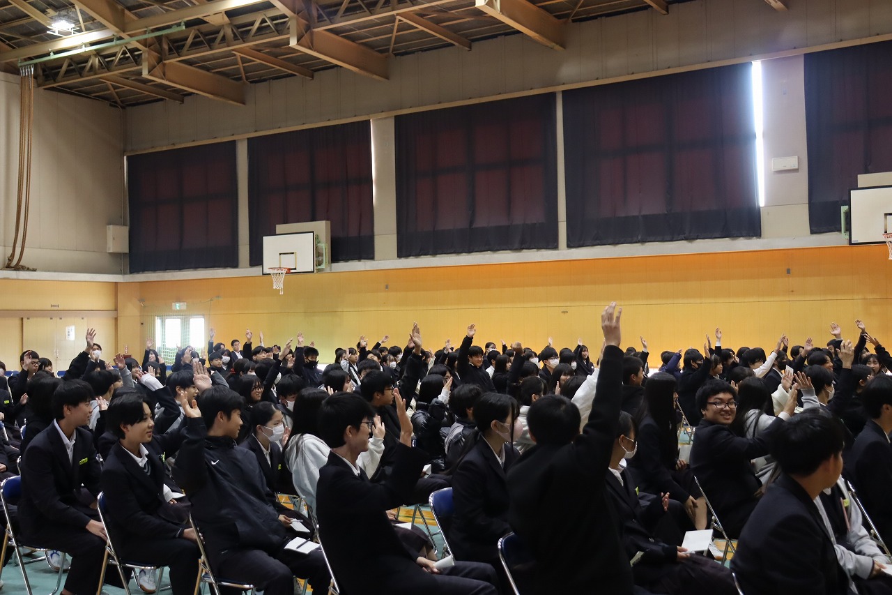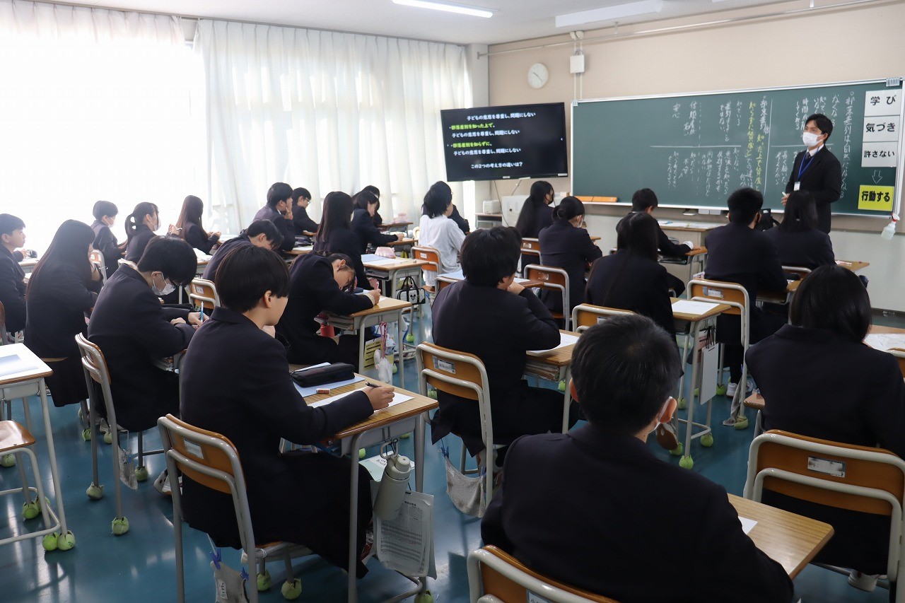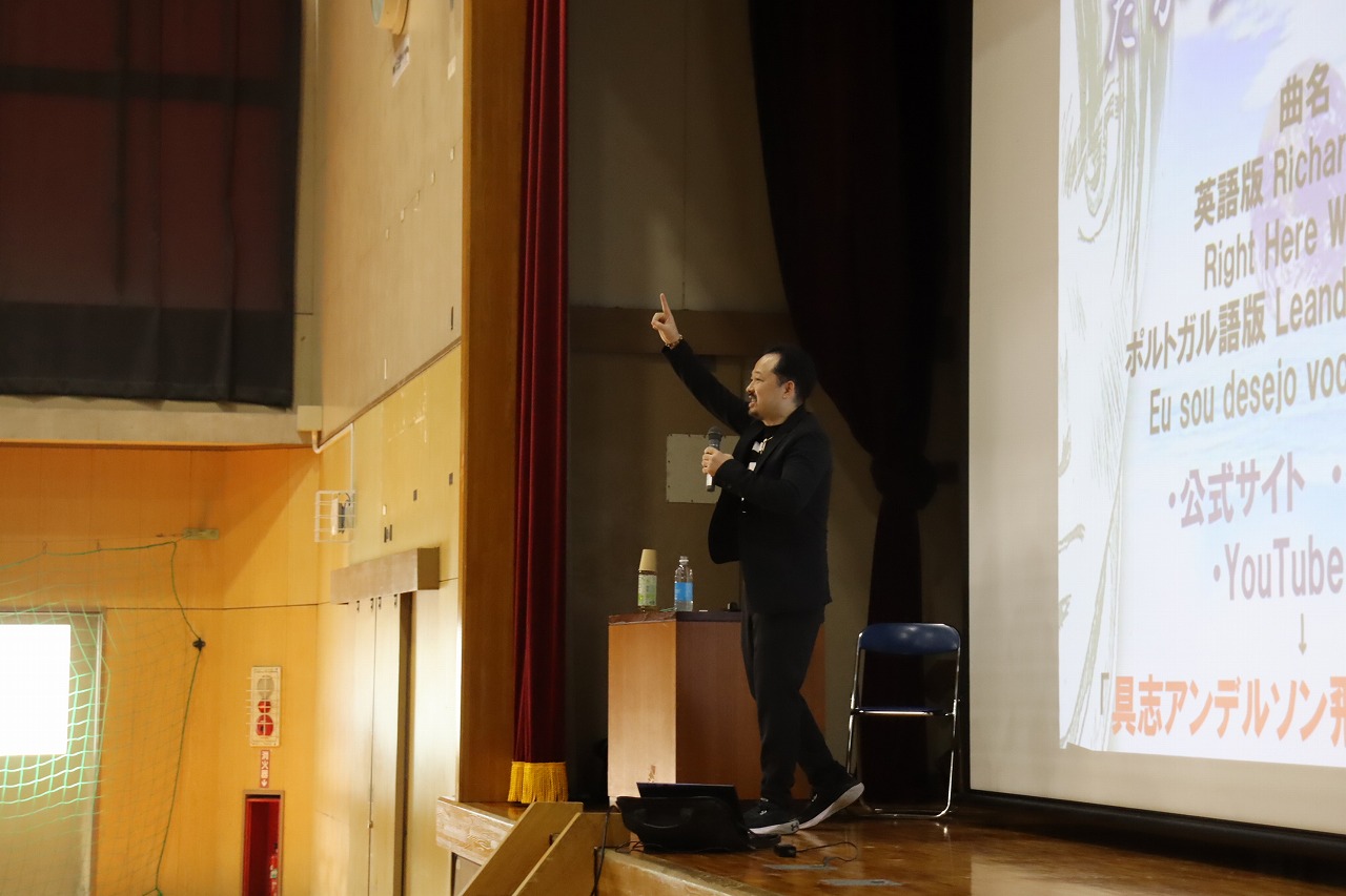 人権学習後、PTA人権講演会を行いました。多文化共生NPO世界人理事長である具志アンデルソン飛雄馬 様にお越しいただき、懸命に生きることの大切さについてご講演いただきました。自身の経験談やたくさんの名言、力強いメッセージに、生徒たちは一生懸命耳を傾けていました。これから先、たくさんの困難や壁にぶつかっても、具志さんからいただいたたくさんの言葉を胸に、一歩一歩進んで行ってほしいと願います。