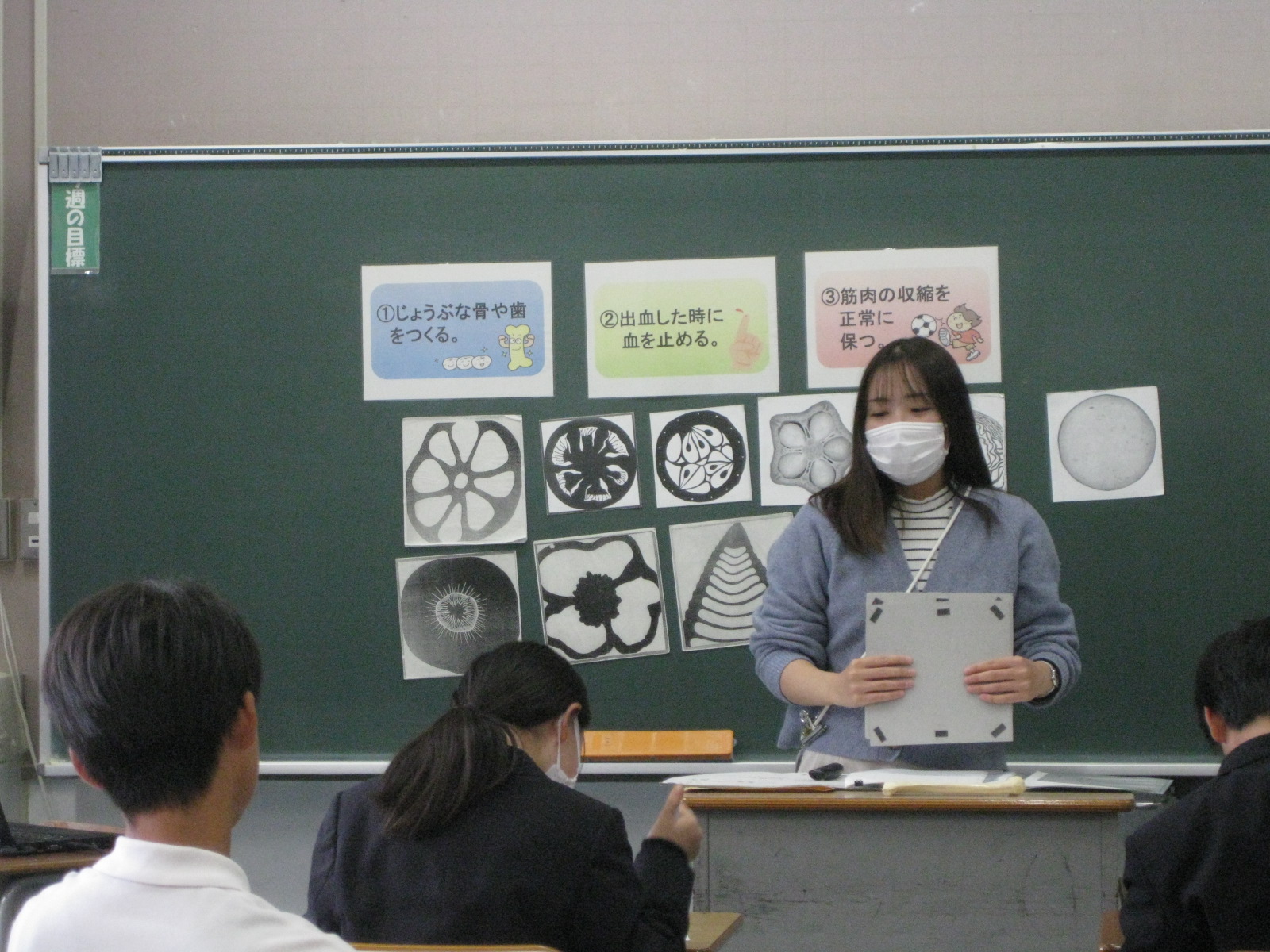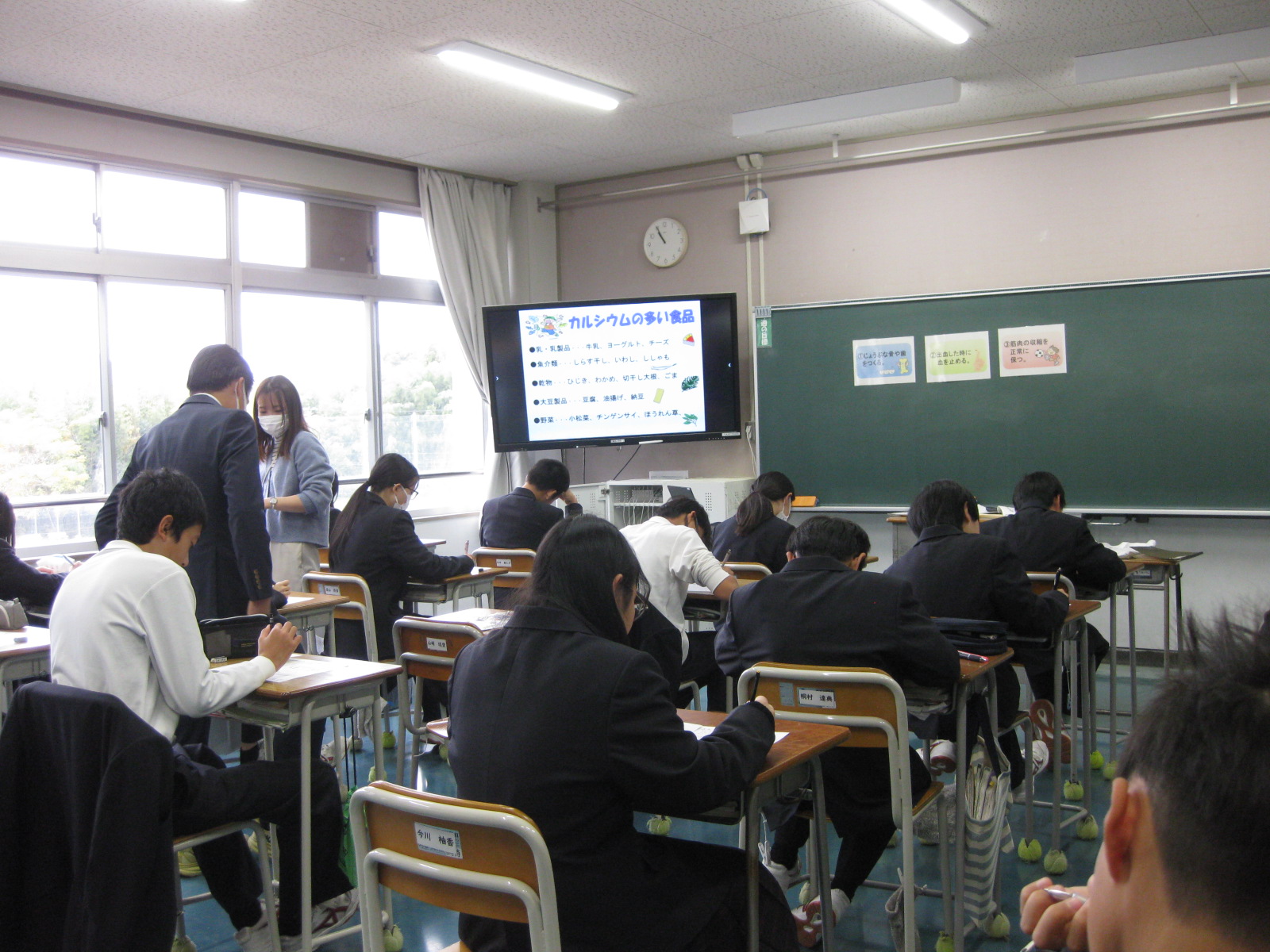 栄養教諭の上田先生を講師にお招きし、1年生が「食に関する指導」の授業を受けました。今回のテーマは「カルシウムを意識した食生活」です。カルシウムの働きを学び、一日の必要量(男子:1000㎎・女子:800㎎)を教えてもらいました。一食あたりでは、男子330㎎、女子270㎎が必要です。カルシウムの多い食品を調べながら、カルシウムがしっかり摂れる献立をみんなで考えました。