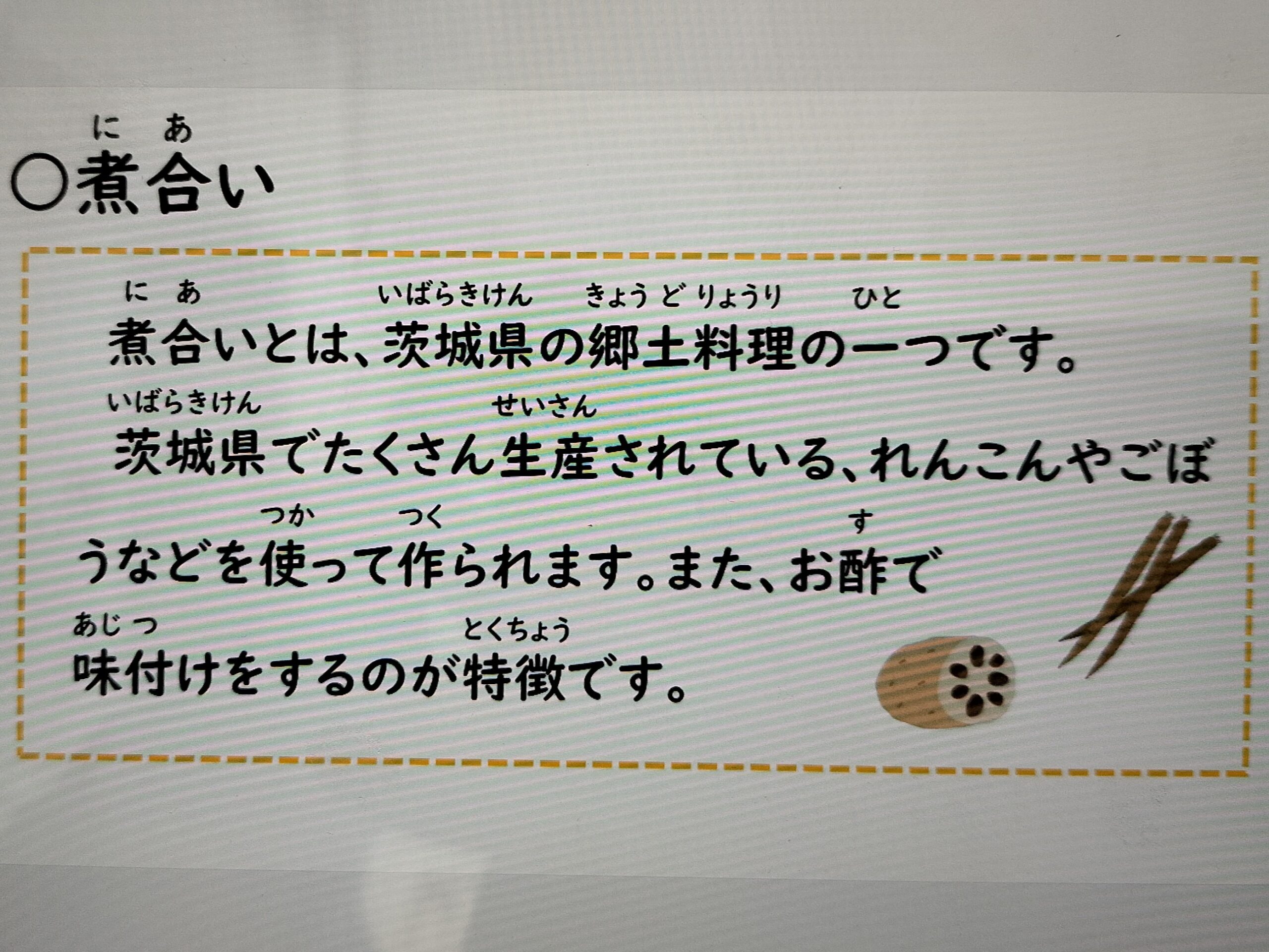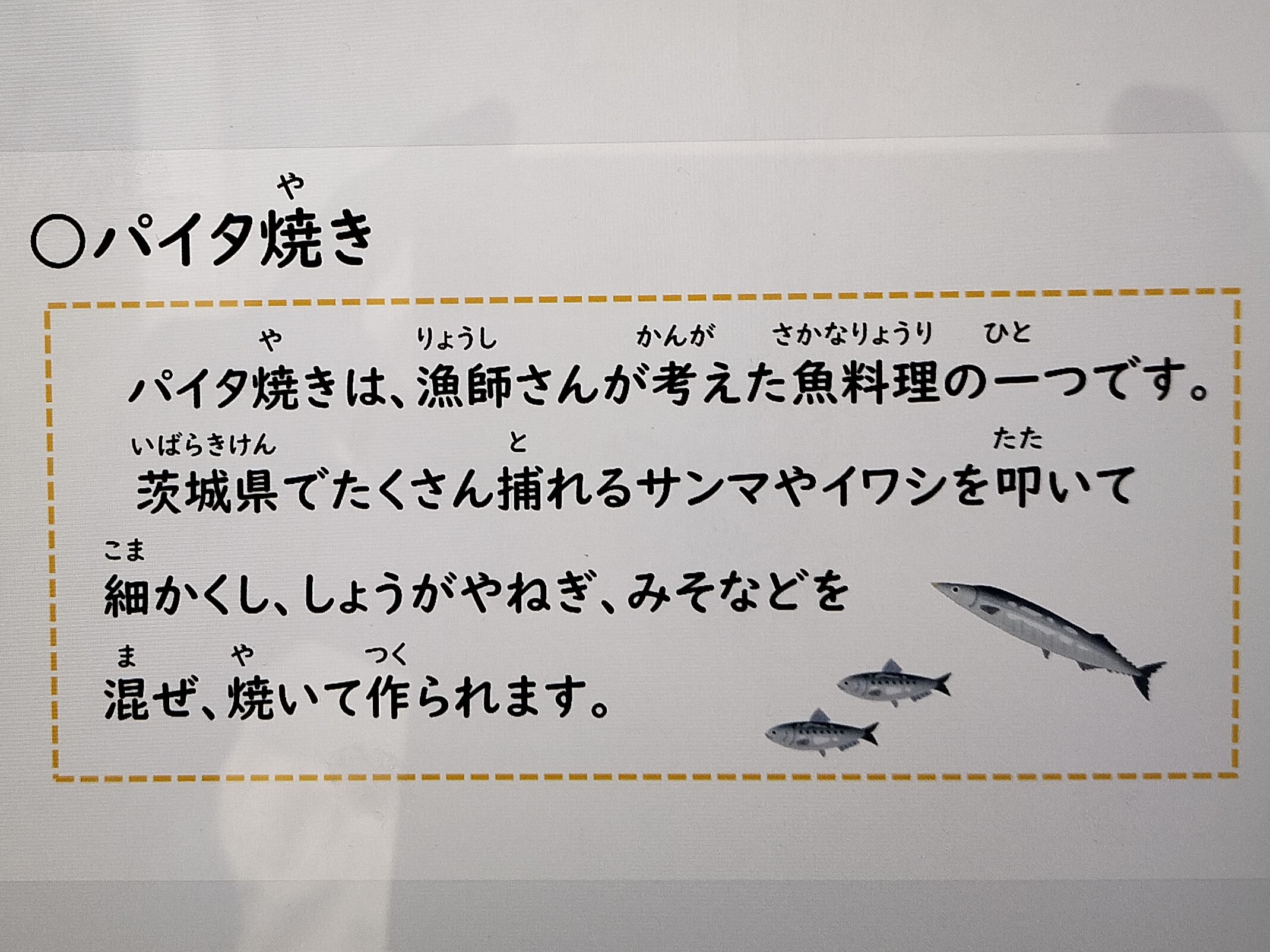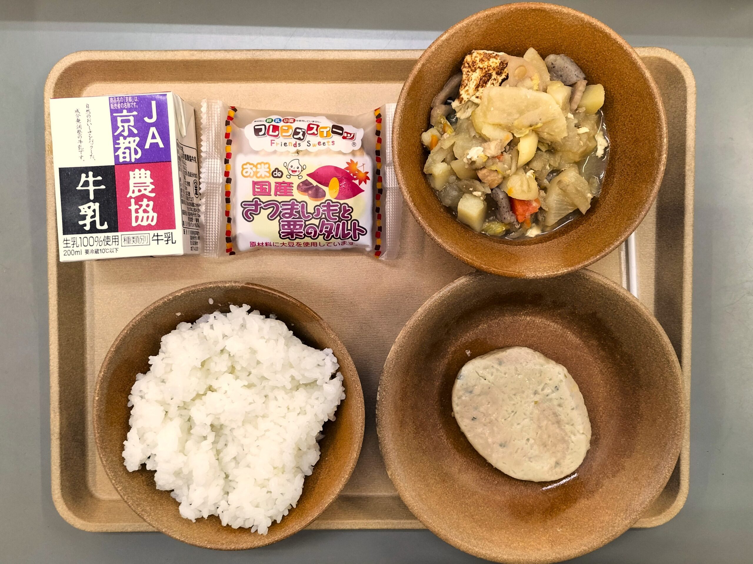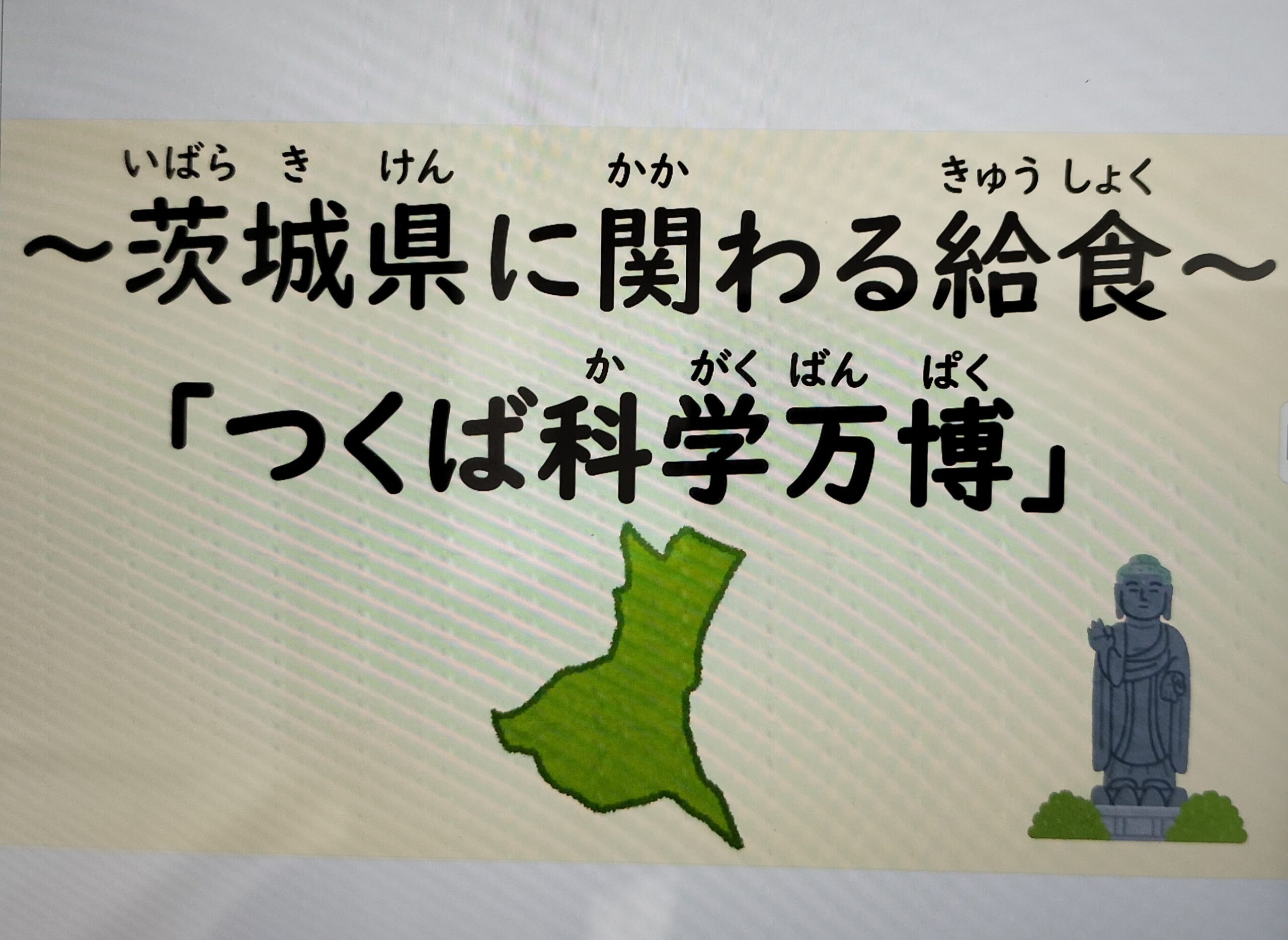 26日(月)は、「つくば科学万博」が開催された茨城県にまつわる献立で、「ご飯・牛乳・煮合い・パイタ焼き・米粉のタルト(さつまいもと栗)」が提供されました。