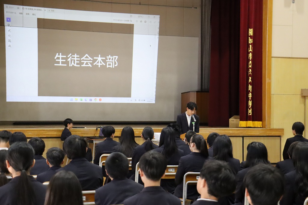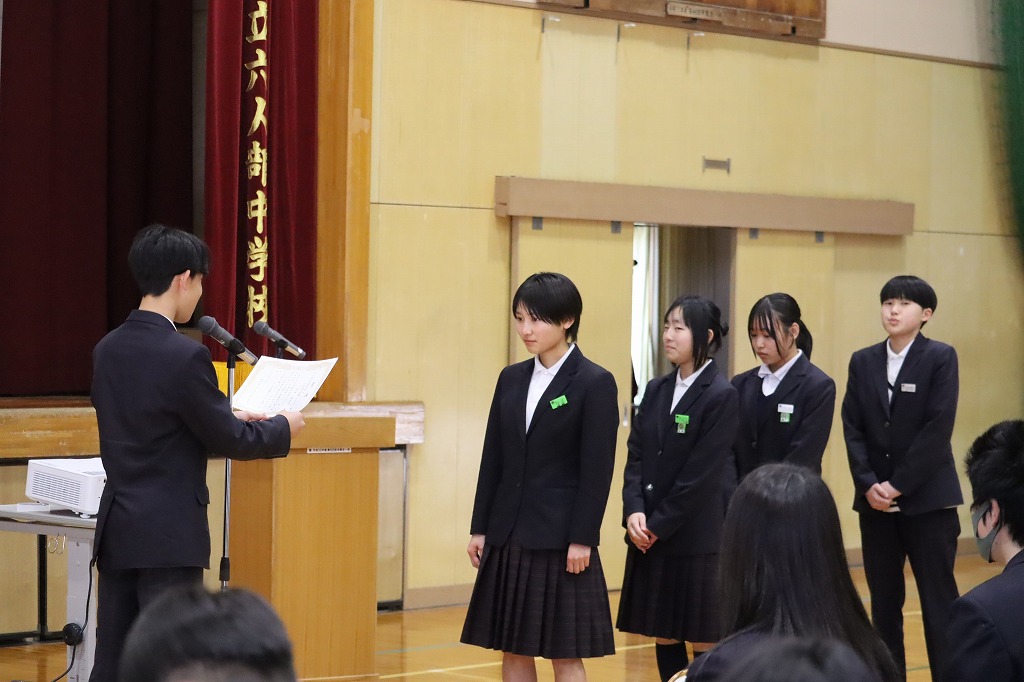 六中日誌3月17日(火)、3年生の卒業後初めての生徒大会がありました。今年度の各学級の総括発表、今後の生徒会・委員会活動の方針や取組の提案等がありました。また、今年度の「つながロックボランティア」運営部を担ってくれた4名の委員に感謝状が手渡されました。ありがとうございました。