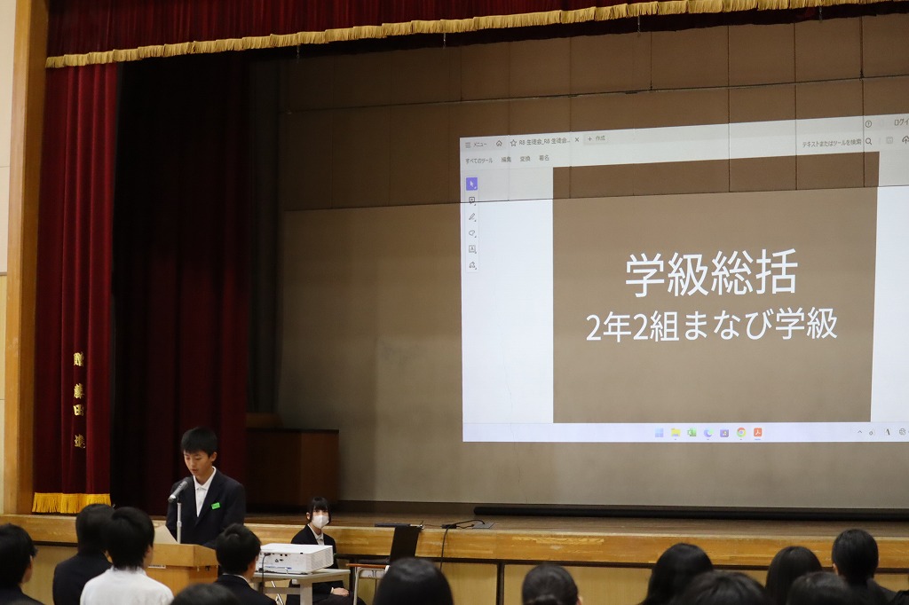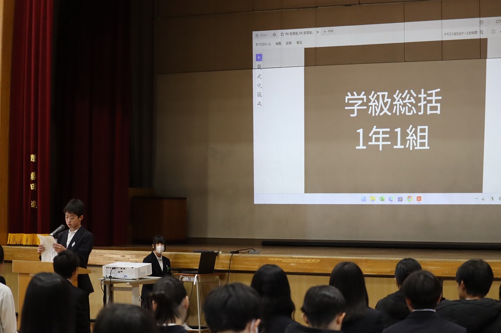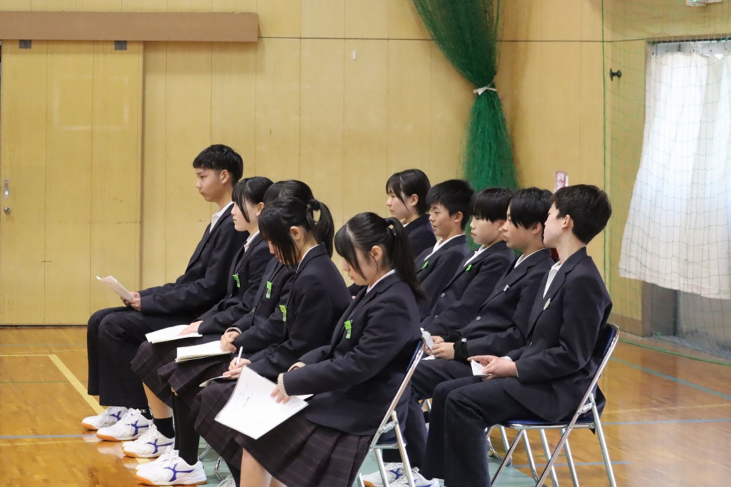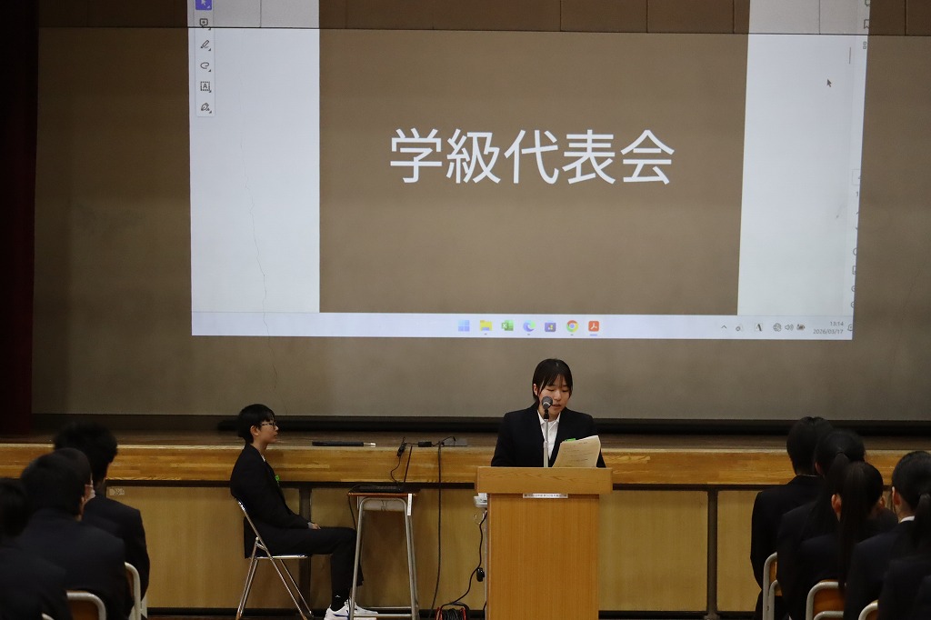 3月17日(火)、3年生の卒業後初めての生徒大会がありました。今年度の各学級の総括発表、今後の生徒会・委員会活動の方針や取組の提案等がありました。また、今年度の「つながロックボランティア」運営部を担ってくれた4名の委員に感謝状が手渡されました。ありがとうございました。