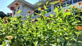六人部中学校の中庭には、名物となっている「花壇」があります。季節ごとの様々な花に彩られる花壇で、用務員さんが心を込めて整えてくださっています。