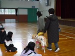 11月13日〜12月12日まで人権月間の取組をしています。その中で、今年度は、目が不自由で盲導犬と生活をされている井上恵美さんに講話をしていただきました。目が不自由な人にも分かるように工夫してある日用品の紹介や井上さんが盲導犬に指示を出し、盲導犬が誘導する様子も見せていただきました。また、「何かできることはありませんか。」と声をかけることが私たちにできることであることも教えていただきました。子ども達の素朴な質問にも丁寧に答えていただき、自分にできることを考え行動することの大切さ等を学ぶことができました。