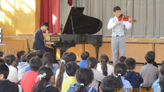 1~3年生は、出前授業で生演奏を聴きました。バイオリンとピアノの協奏曲を、楽しいお話とともに披露していただきました。プロの音楽家の生演奏を聴く機会はそうそうないので、よい体験ができました。